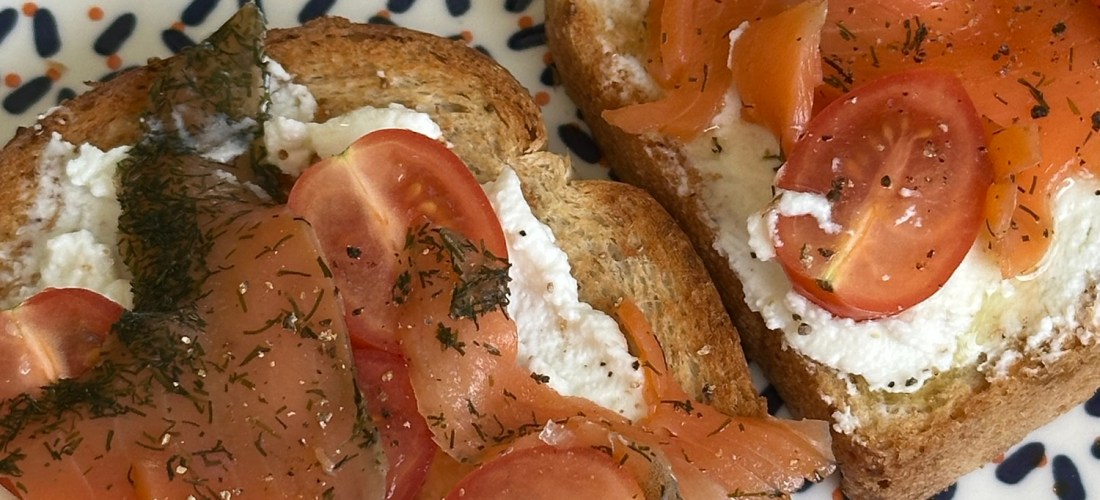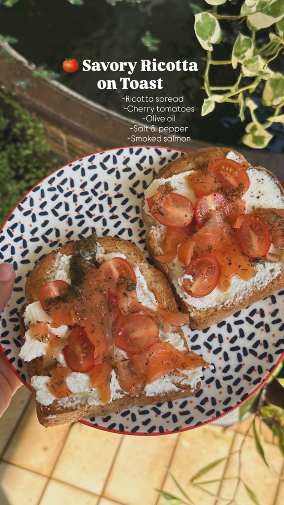 Ricotta on Toast, a pinch of salt, black pepper and a little olive oil. Elevated it with cherry tomatoes and smoked Salmon