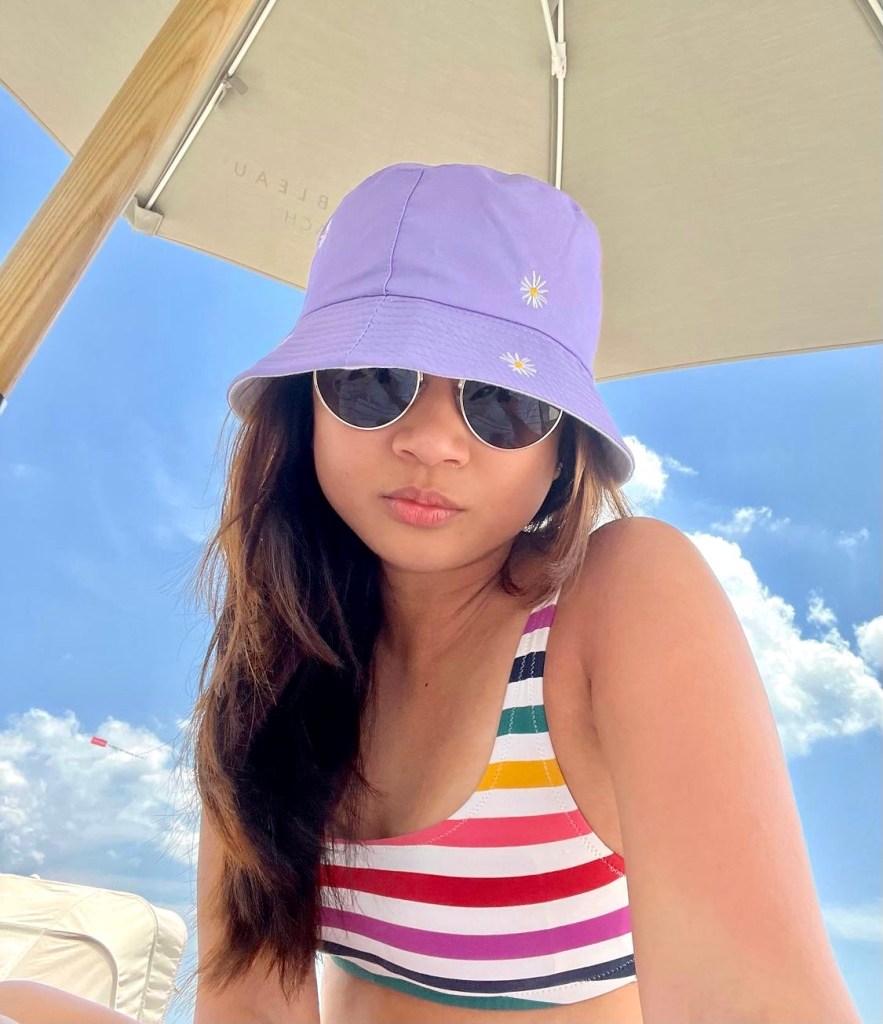 Bring out the hats – You’ll feel hotter as your body absorbs more sun. While you could take an umbrella with you, a more practical and hands-free option is to wear a hat. Switch it up with the good ole bucket hat. The bucket hat is not DEAD! It is still in trend. Spotted Ms Charlette on a beach in a lilac colored bucket hat with cute floral motifs.