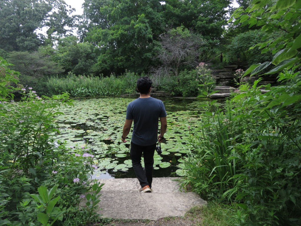 Recently, a friend brought me to the Lincoln Park Lily Pool which is now called the Alfred Caldwell Lily Pool. A 3 acres serene section located right next to the famous Lincoln Park Zoo. It was such a beautiful, tranquil and quiet place hidden in plain-sight. We sat there in front of the lily pond observing the greens all around us, the temple-like structures and babbling baby waterfall hidden behind. It was serene. Lots of birds. We saw hawks/ falcons in the trees and a sneaky frog peeking out of the pond which was my favorite shot from that day.
